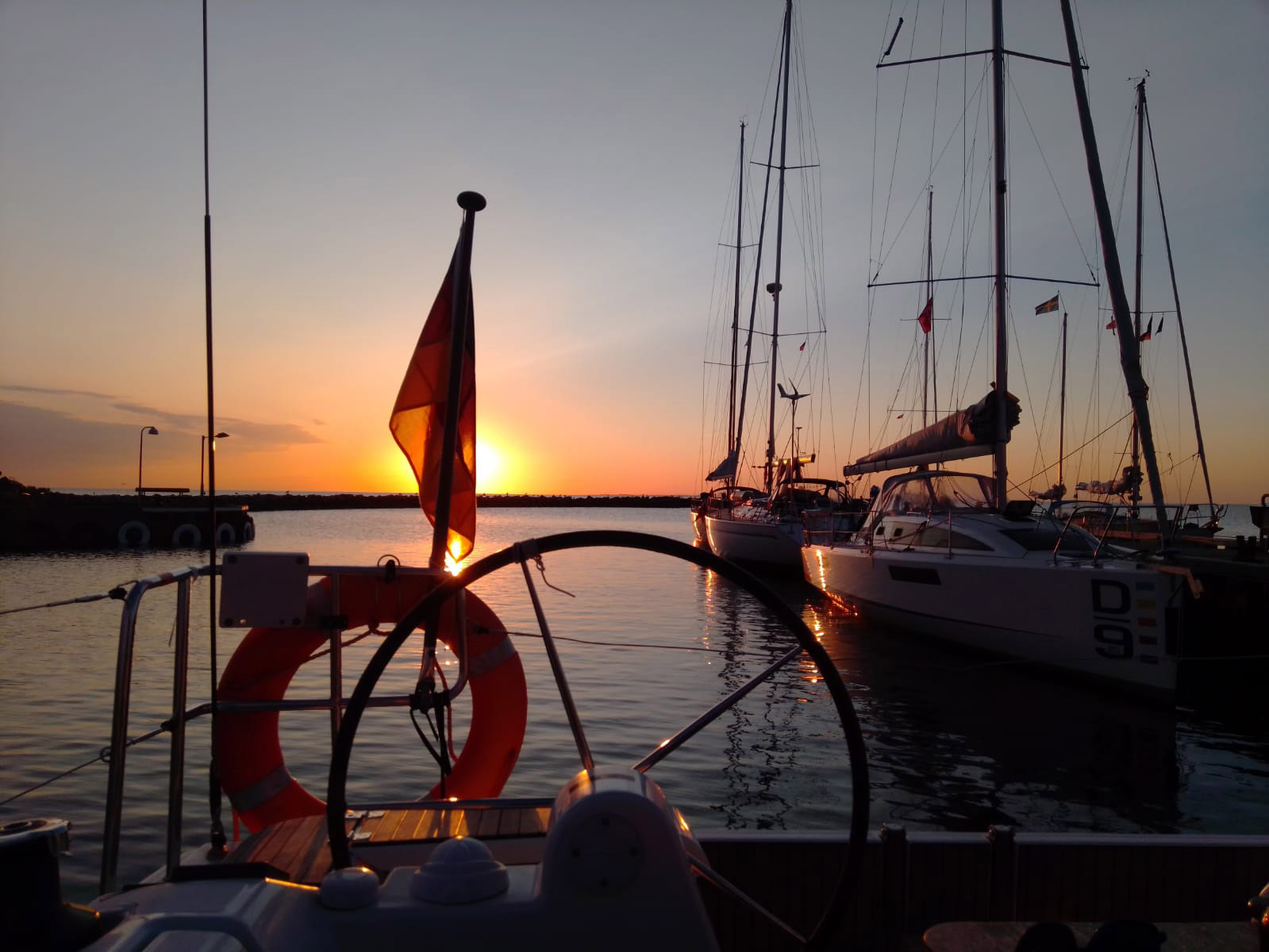 Mit abnehmendem Wind gegen Ende wurde dann doch nach und nach der Motor zugeschaltet, sodass wir kurz vor Sonnenuntergang im Hafen einliefen. Belohnt wurden wir mit einem wunderschönen Abendhimmel.